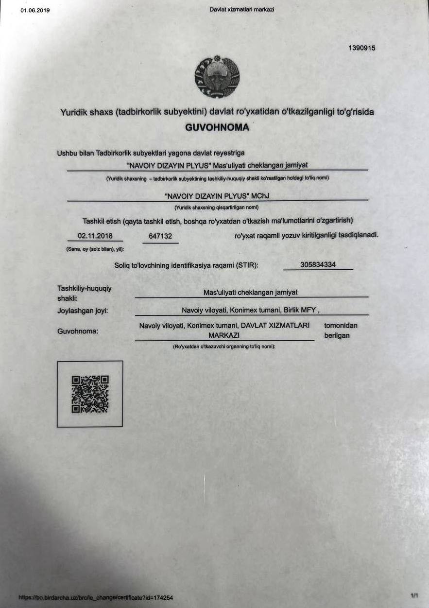 Свидетельство о государственной регистрации юридического лица (субъекта предпринимательства) ООО "NAVOIY DIZAYIN PLUS"